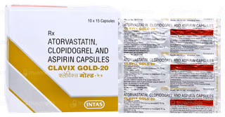 Clavix Gold 20 Capsule is a combination medicine used in the prevention of heart attack. It works by preventing clot formation in the blood vessels. It also helps to reduce increased cholesterol and triglyceride levels and promote cardiac health._x000D_