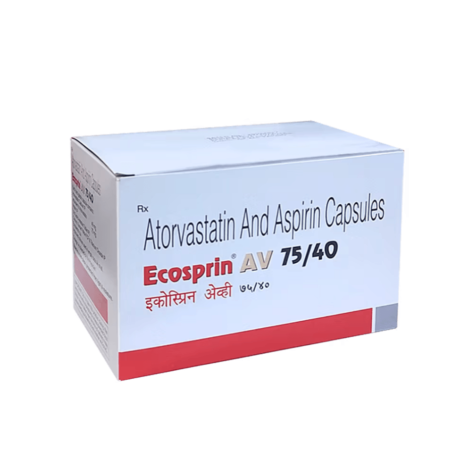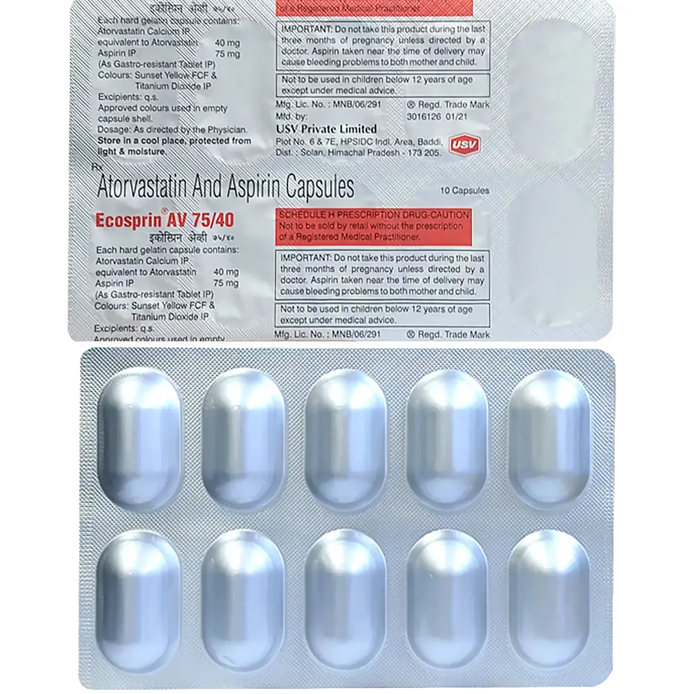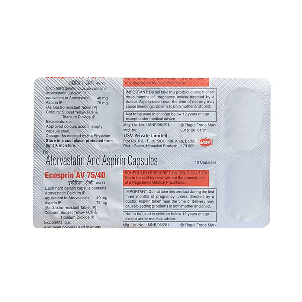 Ecosprin AV 75/40 Capsule is a combination of two medicines used to prevent heart attack and stroke. It lowers the “bad” cholesterol (LDL), triglycerides and raises the “good” cholesterol (HDL) levels in the body. Moreover, it also decreases the formation of blood clots._x000D_