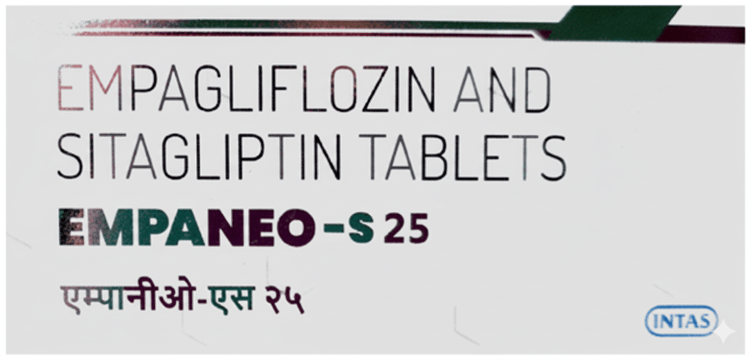 Empaneo-S 25 Tablet is a medicine used to treat type 2 diabetes. It lowers blood sugar by helping the kidneys remove excess sugar and by improving the body’s insulin response for better glucose control.