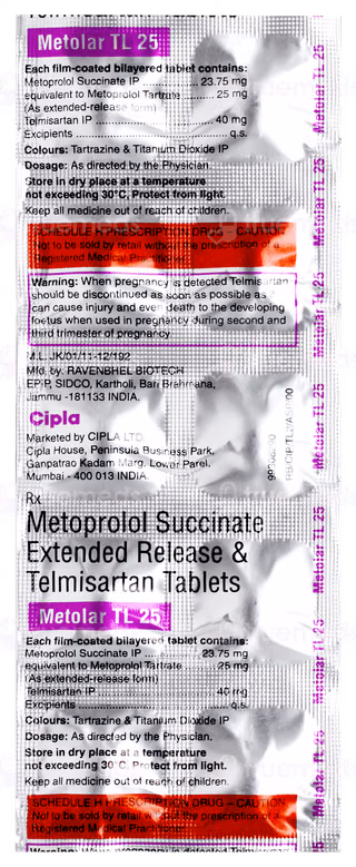 Metolar TL 25 Tablet is a medicine used for treating high blood pressure. By lowering blood pressure, it helps in preventing future heart attacks and strokes.