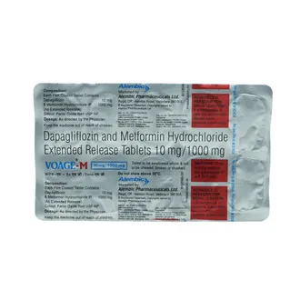 VOAGE M 10/1000 TABLET is used to manage type-2 diabetes mellitus along with diet and exercise when diabetes cannot be controlled with other medicines. It is also used in combination with insulin or GLP-1 receptor agonist like liraglutide. It is a combination of Dapagliflozin and Metformin which belongs to the group of medicines called Antidiabetics. VOAGE M 10/1000 TABLET helps to lowers blood glucose levels, where Dapagliflozin works by removing excess sugar from the body in the form of urine and Metformin works by inhibiting glucose production in the liver._x000D__x000D_Prior to the management, your doctor may want you to take several blood tests to understand your existing kidney condition. Avoid consumption of alcohol while taking VOAGE M 10/1000 TABLET as it may increase the risk of lactic acidosis. VOAGE M 10/1000 TABLET is not recommended for use in patients with liver disease, moderate to severe kidney disease, recent heart attack or acute myocardial infarction, heart failure, septicemia or severe infection, diabetic ketoacidosis, hypoxemia or uncontrolled diabetes. Contact your doctor before taking the medicine._x000D__x000D_VOAGE M 10/1000 TABLET is not recommended for use in second and third trimester of pregnancy unless considered clearly necessary. VOAGE M 10/1000 TABLET is not recommended for use in breastfeeding women as it may pass through the breast milk. VOAGE M 10/1000 TABLET is not recommended for use in children and adolescents under 18 years of age. VOAGE M 10/1000 TABLET should be used with caution in elderly patients (aged 65 years or above). The most common side effects of this medicine are diarrhea, stomach pain and loss of appetite. Contact your physician if any of the above side effects worsen or persists for a longer duration.